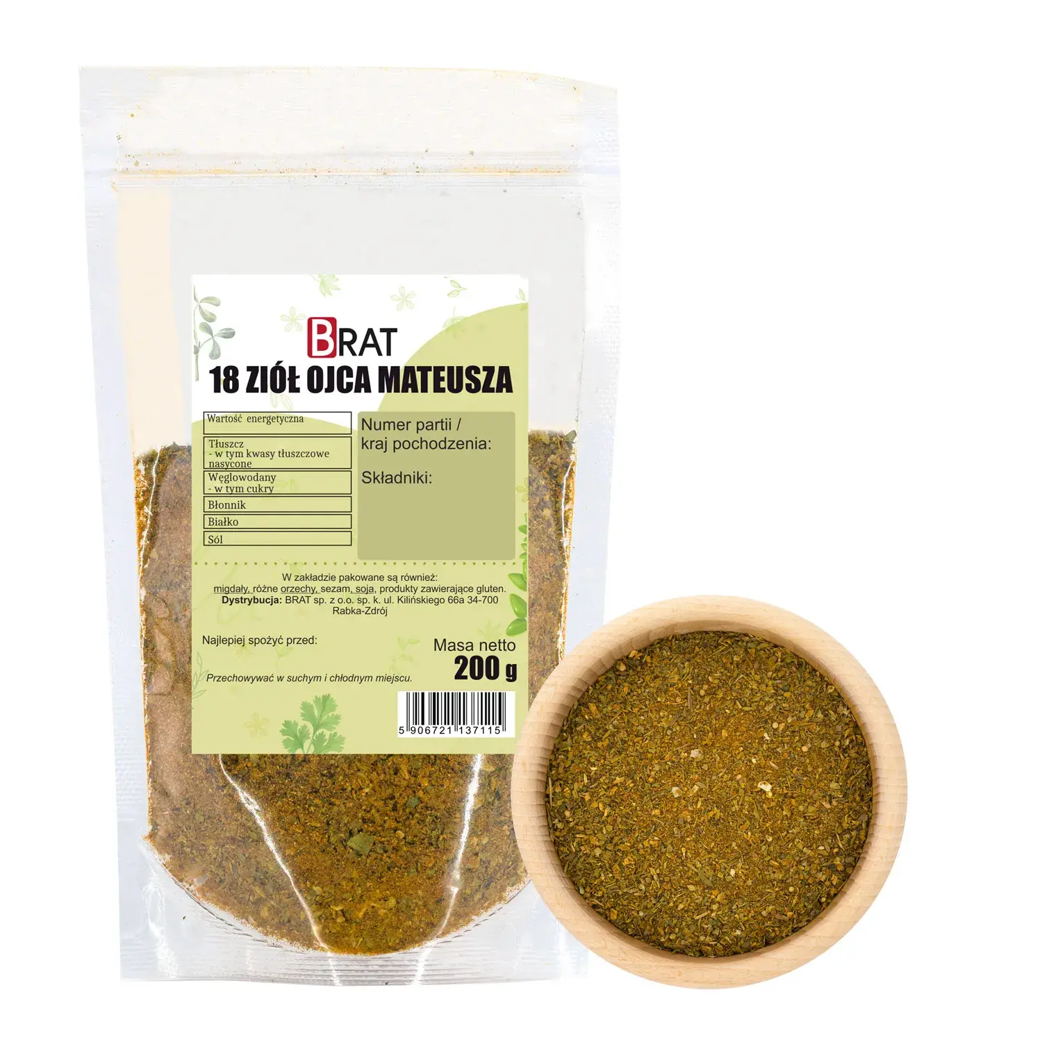 18 ziół Ojca Mateusza to starannie dobrana mieszanka przypraw i ziół, która stanowi zdrową alternatywę dla soli. Dzięki szerokiemu wachlarzowi składników zapewnia głęboki smak oraz aromat każdej potrawie, jednocześnie wspomagając procesy trawienne i działając korzystnie na organizm.
