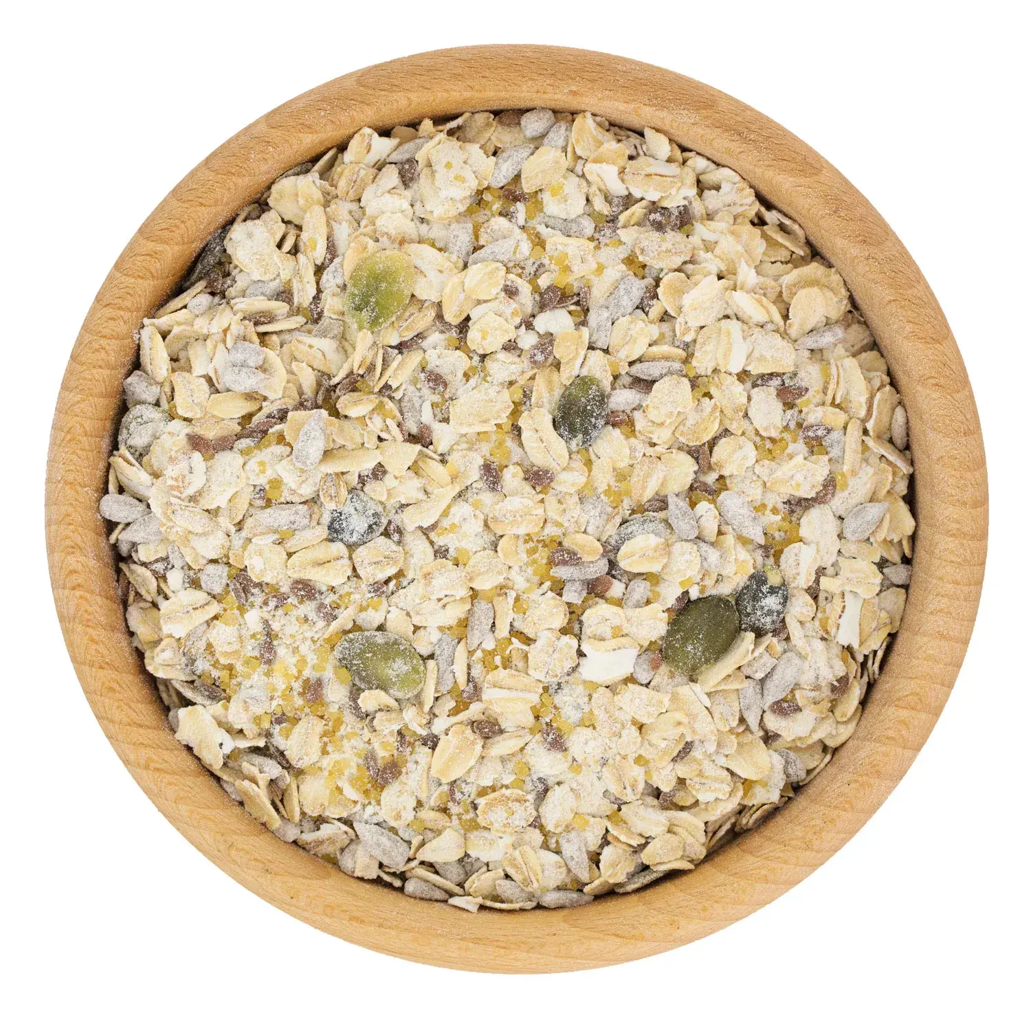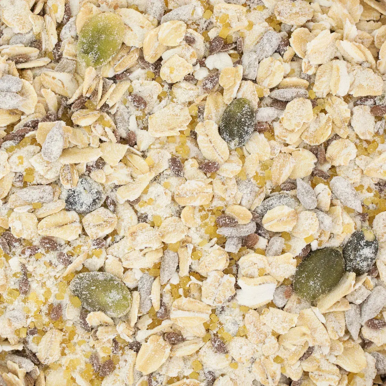 Płatki owsiane i mąka orkiszowa stanowią źródło błonnika pokarmowego, wspierającego prawidłowe trawienie. Ziarna słonecznika, siemię lniane i pestki dyni dostarczają zdrowych tłuszczów, witaminy E oraz minerałów, takich jak magnez i cynk. Cukier trzcinowy nadaje delikatnej słodyczy, a proszek do pieczenia ułatwia przygotowanie ciasta o lekkiej strukturze. Mieszanka nie zawiera sztucznych dodatków – to gotowa baza, którą możesz urozmaicić ulubionymi składnikami, np. bakaliami czy kawałkami czekolady.