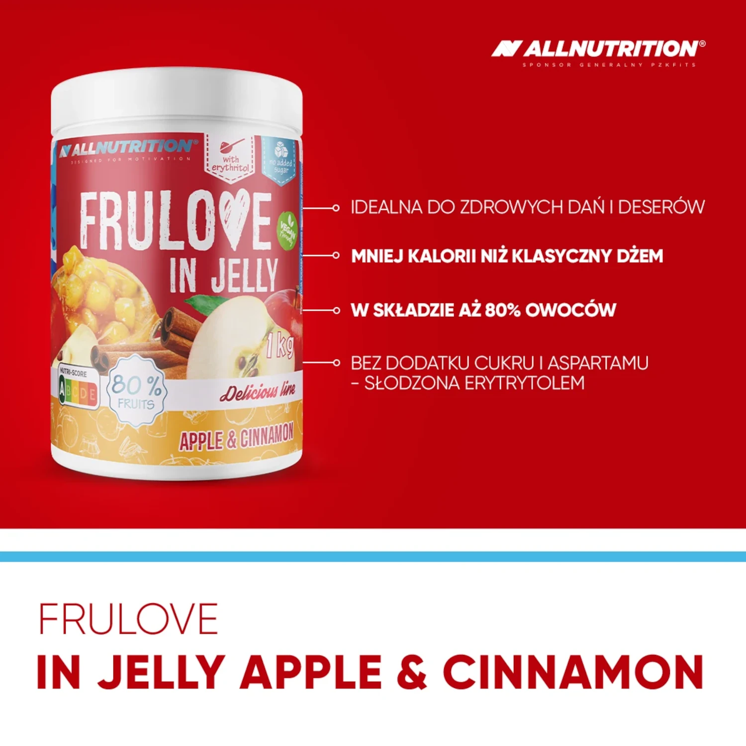 Allnutrition frulove in jelly apple & cinnamon to przepyszna frużelina bez dodatku cukru z całymi kawałkami jabłek, aż 80% zawartości owoców! Stworzona z myślą o wszystkich tych, którzy chcą zadbać o sylwetkę, jednocześnie nie rezygnując w swojej diecie z odrobiny słodkiej przyjemności.