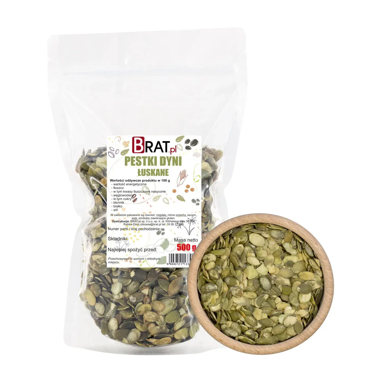 Opakowanie zawiera 500 g surowych pestek dyni.